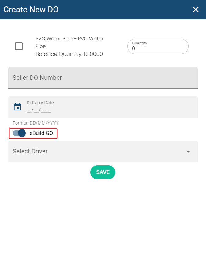 Create new DO will pop up. Fill in the form with the details accordingly. Check on the checkbox for eBuild Go and select the driver from the dropdown list. Click on the 'Save button to create the delivery order.